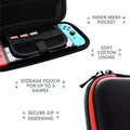 - حقيبة حماية صلبة: بطانة داخلية من القطن الناعم للحفاظ على الجهاز خاليًا من الخدوش، وجيب تخزين بفيكرول لعدد يصل إلى 5 ألعاب، مع تفاصيل حمراء وزرقاء نيون.