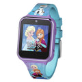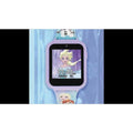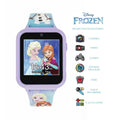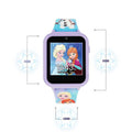 Disney's Frozen Interactive Watch with lilac plastic case and Frozen character printed silicone strap. The watch features: 10 watch faces, 3 wallpapers, selfie photo/video camera, games, fitness tracker, alarm/stopwatch/timer, voice recorder, calculator, device settings.